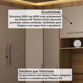 Caracteristicas: Estrutura: 100 MDP Acabamento: Perfect Foil -PF- Quantidade de Portas: 7 Tipo de Abertura das Portas: 5 de Bater e 2 Basculantes Quantidade de Gavetas: 5 Tipo de Corredicas: Telescopica Tipo de Cabideiros: 1 em Aluminio Tipo de Puxador: Plastico PS Tipo de Pes: Rodape Sistema de Montagem: Cavilhas, Parafusos e Minifix Garantia: 3 meses