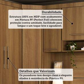 Caracteristicas: Estrutura: 100 MDP Acabamento: Perfect Foil -PF- Quantidade de Portas: 7 Tipo de Abertura das Portas: 5 de Bater e 2 Basculantes Quantidade de Gavetas: 6 Tipo de Corredicas: Telescopica Tipo de Cabideiros: 1 em Aluminio Tipo de Puxador: Plastico PS Tipo de Pes: Rodape Sistema de Montagem: Cavilhas, Parafusos e Minifix Garantia: 3 meses