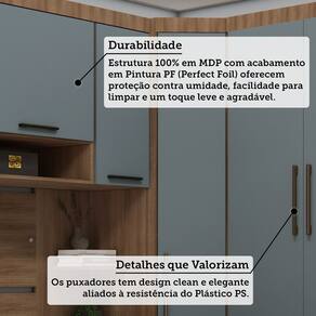 Caracteristicas: Estrutura: 100 MDP Acabamento: Perfect Foil -PF- Quantidade de Portas: 8 Tipo de Abertura das Portas: 6 de Bater e 2 Basculantes Quantidade de Gavetas: 6 Tipo de Corredicas: Telescopica Tipo de Cabideiros: 1 em Aluminio Tipo de Puxador: Plastico PS Tipo de Pes: Rodape Sistema de Montagem: Cavilhas, Parafusos e Minifix Garantia: 3 meses