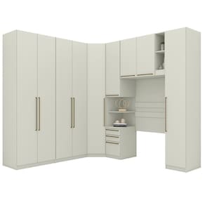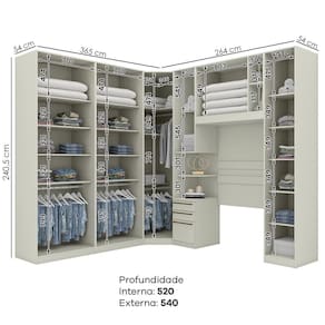 Com estrutura em MDP de 15 mm e portas em MDF/BP de 15 mm (fundo com 3 mm), possui dobradiças metálicas de 35 mm com amortecimento, 3 gavetas com corrediças telescópicas, 15 prateleiras com capacidade de até 8 kg cada, puxadores de alça, cabideiros e calceiros em alumínio e acabamento em pintura UV texturizada (fosco ou semibrilho).