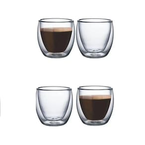 Quatro Copos em vidro borosilicato duplo, cafe cha, 80 ml coracao Quatro copos de vidro com parede dupla. Alem do visual muito bonito, sem mantem mais quentinho. Formato interno coração