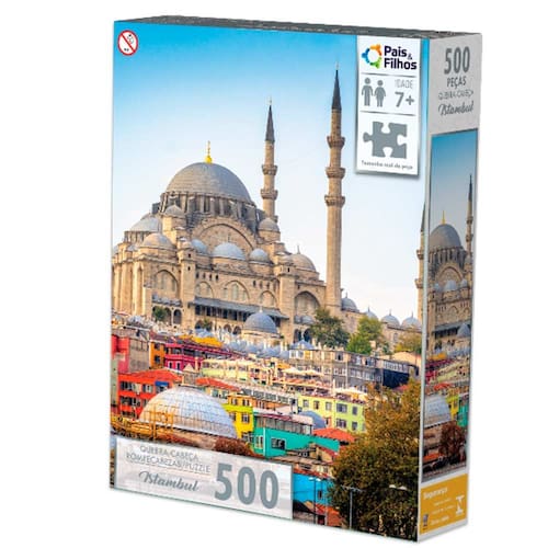 Quebra-Cabeça - 500 Peças - Istambul – Pais e Filhos : Um dos principais pontos turísticos localizados na cidade de Istambul, a Mesquita Süleymaniye ou de Solimão foi construída para simbolizar o poder e a riqueza do Império Otomano, que atingiu seu auge durante o reinado do sultão Suleyman. Puzzle Pais e Filhos Istambul 500 é composto por peças produzidas em papel cartão com qualidade de impressão em alta definição para valorizar cada detalhe dessa linda imagem. As peças são de fácil encaixe para a brincadeira ser completa. Montado tem a dimensão de 37.0 cm de altura por 54.0 cm de comprimento • Dicas de como montar: 1) Antes de montar, arranje uma base um pouco maior do que o quebra-cabeça a ser montado. 2) Comece separando o quebra-cabeça pelas peças com laterais sem encaixe para a montagem das bordas. 3) Organize as demais peças por cor, para facilitar a visualização do espaço que cada peça deverá ocupar. 4) Inicie por um dos cantos e continue a compor a figura orientando-se pelas cores e pela ilustração. 5) Sempre monte o quebra-cabeça em um lugar plano e, após terminado, verifique se todas as peças estão encaixadas corretamente. 6) Quando terminar de montar esse lindo quebra-cabeça de cachorrinhos, você pode emoldurar para usar como parte da decoração Informações: • Produto: Quebra-Cabeça - 500 Peças - Istambul – Pais e Filhos • Marca: Pais e Filhos • Coleção: Istambul • Tipo: Quebra-Cabeça • Categoria: Quebra-Cabeça e Puzzles • Dimensões: 54.0 x 37.0 cm (montado) • Conteúdo: 1 puzzle de 500 peças • Recomendação: para crianças a partir de 7 anos de idade Especificações: • Referência: 7624751 • Código de Barras: 7908470024751 • Embalagem (C x A x L): 20,5 x 27,0 x 6,0 cm • Embalagem (Peso): 0,308 • Registro: 003808/2019 CE-BRI/ICEPEX- N 01264-25 • Material / Composição: papel e papel cartão • Certificado: Órgãos Autorizados - OCP´S (Organismos de Certificação de Produtos) Aviso: • As imagens são meramente ilustrativas • Os tamanhos e medidas são aproximados • As cores e estampas dos produtos podem ter variações • As informações são de responsabilidade do fabricante ou fornecedor