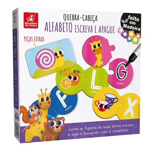 aprender a escrever ficou mais divertido com esse incrível quebra-cabeça desenhe letras juntando-as à figura correspondente. São 26 quebra-cabeças mais 7 peças extras para treinar os movimentos brincando com a caneta. Auxilia na interação social, no processo de alfabetização, raciocínio lógisco e coordenação motora. - marca: brincadeira de criança - dimensões: 25,5 x 26,5 x 4 cm - e lacrado - contém: 26 quebra-cabeças, 59 peças em mdf, 1 canetão e um apagador recomenda-se guardas as peças limpas, sem resquícios de tinta a fim de evitar manchas. - faixa etária: indicado para crianças à partir de 4 anos - ean: 7898565511511 - certificado pelo inmetro ce-bri/ocp 0133 registro 006333/2021