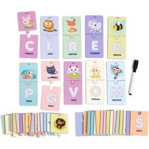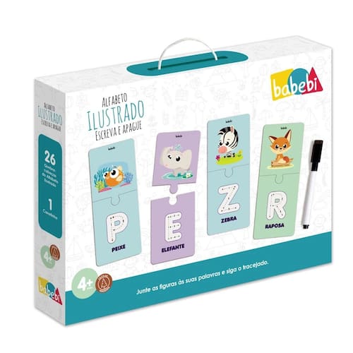 O Quebra-Cabeça Alfabeto Ilustrado Escreva e Apague, da Babebi é um recurso educativo que combina alfabetização e brincadeira criativa. Composto por 26 peças de quebra-cabeça com letras e ilustrações e uma canetinha esferográfica reutilizável, permite que a criança junte a figura à letra inicial e trace o contorno quantas vezes desejar estimulando a alfabetização, coordenação motora fina e associação de ideias de forma sustentável.