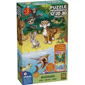 O Puzzle Progressivo traz na mesma caixa três quebra-cabeças diferenciados, em que as quantidades e os tamanhos das peças determinam níveis crescentes de dificuldade. As peças do verso também são diferentes, para facilitar a separação dos modelos. Inicie a montagem pelo quebra-cabeça de 12 peças, a fim de que a montagem das ilustrações de 20 e 30 peças ofereça um desafio progressivo e atraente.