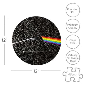 - Quebra-cabeça JIGSAW de 450 peças: monte este deslumbrante quebra-cabeça de disco de 450 peças da capa de um dos álbuns mais icônicos e bem-sucedidos de todos os tempos, The Dark Side of the Moon, um álbum conceitual do Pink Floyd. O quebra-cabeça completo mede 30 x 30 cm