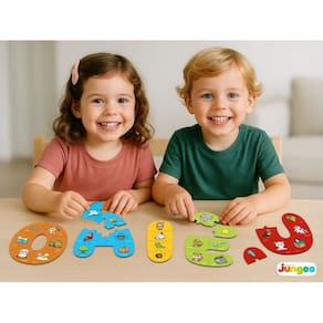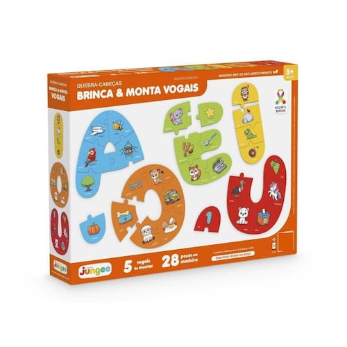 O Quebra-cabeças Brinca & Monta Vogais da Junges contém 28 peças em madeira de reflorestamento (MDF). São 5 quebra-cabeças de 4 a 6 peças cada, com impressão direta na madeira, garantindo durabilidade, resistência e alta qualidade.