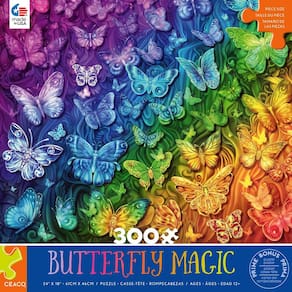 Ceaco - Butterfly Magic - Quebra-cabeça de 300 peças grandes - Contém um quebra-cabeça de 300 peças grandes. - Molde feito à mão com peças de formato exclusivo. Feito nos EUA. Fabricado de forma sustentável. - Apresenta imagens coloridas. - Colecione todos os estilos da sua coleção favorita. - Ótimo para noites em família, presentes, reuniões de férias, festas e muito mais. Quebra-cabeça de alta qualidade, inovador e desafiador da Ceaco, intrigando milhões desde 1987!