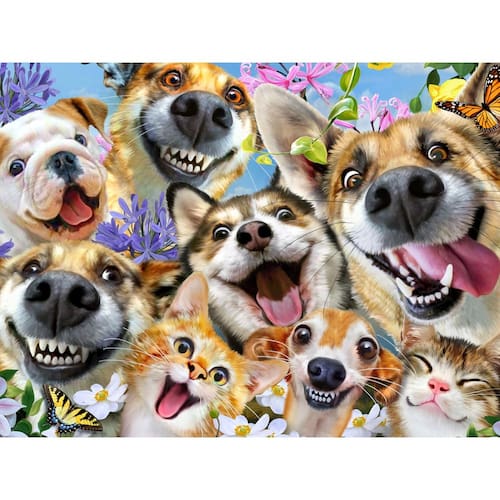 Ceaco - Selfies - Selfies de companhia - Quebra-cabeça de 500 peças - Contém um quebra-cabeça de 500 peças da coleção Selfies. - Molde feito à mão com peças de formato exclusivo. Feito nos EUA. Fabricado de forma sustentável. - Apresenta imagens coloridas. - Colecione todos os estilos da sua coleção favorita. - Ótimo para noites em família, presentes, reuniões de férias, festas e muito mais. Quebra-cabeça de alta qualidade, inovador e desafiador da Ceaco, intrigando milhões desde 1987!