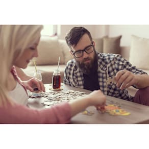 - As peças do quebra-cabeça são presas dentro de uma bolsa e embaladas em uma caixa colorida