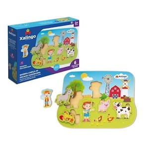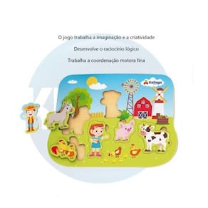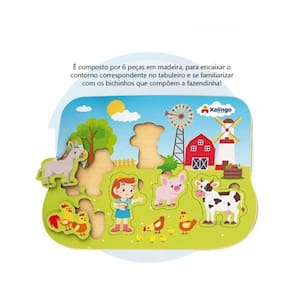 O jogo ajuda as crianças a se inspirarem e a trabalhar a imaginação e a criatividade, bem como, desenvolver o raciocínio lógico e a coordenação motora fina de forma lúdica. É composto por 6 peças em madeira, para encaixar o contorno correspondente no tabuleiro e se familiarizar com os bichinhos que compõe a fazendinha! O objetivo da brincadeira é a criança entender o contexto da cena e através das formas das peças soltas associar o encaixe no local correto.Características:Inmetro: CE-BRI/IQB 005923Dimensões aproximadas: 23,5x6x31cmComposição/Material: Madeira Reflorestada Marca: XALINGO S A