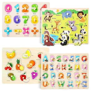 [CONJUNTO DE 4 PACOTES DE QUEBRA-CABEÇAS DE MADEIRA]: Nosso conjunto de quebra-cabeças inclui um quebra-cabeça numérico com números de 15 peças, um quebra-cabeça ABC com alfabeto de 26 peças, um quebra-cabeça de animais selvagens com animais de 8 peças e um quebra-cabeça de frutas com 11 peças de frutas diferentes.