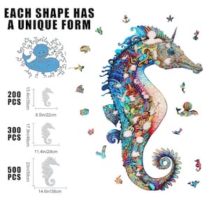 Quebra-cabeças de madeira para adultos 200 300 500 peças Quebra-cabeça exclusivo de madeira em forma de animal Quebra-cabeça Cool Charming O melhor presente para adultos - QUEBRA-CABEÇA DE MADEIRA EXCLUSIVO: O quebra-cabeça é inspirado na natureza, colorido e exclusivo. Arte autêntico e vívida pintada à mão, fascinante e digna de ser usada como decoração estética. Padrões misteriosos e pequenos pedaços de ovos orientais oferecem a melhor experiência de quebra-cabeça. - QUALIDADE INSUPERÁVEL: A melhor tecnologia de produção, usamos madeira HDF, impressão UV, corte a laser, precisão de 0,03 mm. A textura é extremamente lisa, não quebram nem desbotam, são livres de formaldeído e odor e têm mechas perfeitas! Ele pode ser surpreendentemente preservado por décadas. - IDEIAS FANTÁSTICAS: Um poderoso cavalo-marinho unicórnio, dê asas à sua imaginação para apreciar cada quebra-cabeça e elemento. Acalme sua mente, estimule a meditação criativa e use sua criatividade prática para concluir esse trabalho, que ajuda a criar jogos e resolver problemas. Também traz horas de diversão para todos os membros da família. - PRESENTE PERFEITO: Procurando presentes íntimos de aniversário ou Natal? Esses quebra-cabeças de madeira exclusivos são a escolha perfeita! Ofereça horas de entretenimento para seus entes queridos. Ou coloque o trabalho montado na moldura da foto e entregue a ela. - SATISFAÇÃO GARANTIDA: Uma caixa de armazenamento de madeira clássica e moderna. Nós nos preocupamos com cada cliente e cada pedido, por favor, compre com confiança! Oferecemos uma garantia de reembolso de 60 dias para cada compra. Se houver alguma peça faltando ou danificada, para obter um reembolso total ou uma substituição.