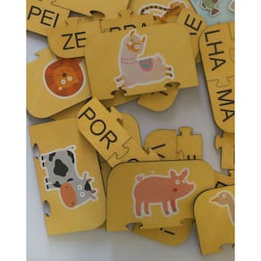 O que você vai encontrar neste kit? 36 mini quebra-cabeças de madeira com figuras de animais e seus nomes separados em sílabas. 1 livro de atividades com desafios que reforçam leitura, associação e percepção visual. Material resistente, perfeito para uso em casa, escolas e terapia.