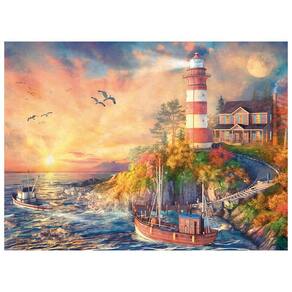 Deixe-se levar pela calmaria do entardecer com este quebra-cabeça que parece uma pintura viva. A imagem retrata um farol à beira-mar, iluminado pelos últimos raios dourados do pôr do sol, guiando com firmeza os barcos que retornam para casa ao cair da noite.