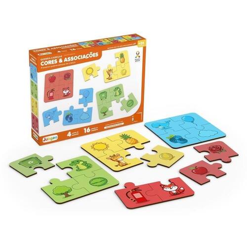 O Quebra-cabeças Cores & Associações da Junges contém 16 peças em madeira de reflorestamento (MDF). São 4 quebra-cabeças de 4 peças cada, com impressão direta na madeira, garantindo durabilidade, resistência e alta qualidade.
