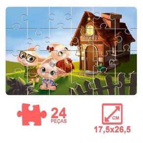 Quebra-cabeça educativo com ilustração temática dos Três Porquinhos, desenvolvido para auxiliar no estímulo ao raciocínio lógico, coordenação motora e memória das crianças. Com 24 peças confeccionadas em papel cartão resistente, é ideal para o público infantil a partir de 4 anos. Produto indicado para uso individual ou em grupo, promovendo aprendizado e interação.