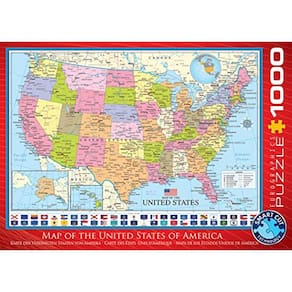 Mapa EuroGráfico do Mundo 1000-Piece Puzzle. Tamanho da caixa: 10" x 14" x 2,37". Tamanho finalizado: 19,25" x 26,5". O Mapa dos Estados Unidos inclui grandes cidades e capitais, juntamente com bandeiras estaduais.