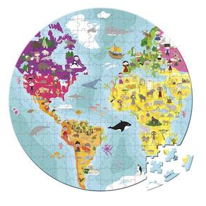 Esse quebra-cabeça é dupla face, ou seja, possui ilustrações diferentes em cada lado. Assim, as crianças poderão montar o mapa-múndi em um lado e, ao virar as peças, descobrirão uma outra ilustração relacionada ao tema.