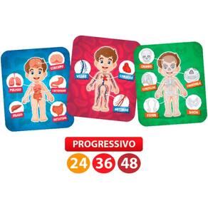Quebra-Cabeça Progressivo - 24, 36 e 48 Peças – Corpo Humano - Pais e Filhos: O quebra-cabeça para você conhecer um pouco mais sobre a anatomia humana! Ele traz três imagens do corpo humano ilustrando os órgãos como fígado, pulmão, estômago, cérebro e intestino, suas ligações, como coração, artérias e veias, com destaque especial para crânio, costelas, mandíbula, fêmur e bacia. A imagem deste quebra-cabeça é meramente ilustrativa. Mais que um passatempo divertido, os quebra-cabeças desenvolvem o raciocínio, relaxam e se transformam num autêntico hobby. Detalhes: • As peças do verso são diferentes para facilitar a separação dos modelos • Inicie a montagem pelo quebra-cabeça de 24 peças, a fim de que a montagem das ilustrações de 36 e 48 peças ofereça um desafio progressivo e atraente • Começando pelo mais fácil, a dificuldade aumenta a cada quebra-cabeça que a criança monta • As crianças vão se divertir com este quebra-cabeça progressivo! Informações: • Produto: Quebra-Cabeça Progressivo Corpo Humano • Marca: Pais e Filhos • Tipo: Quebra-Cabeça Progressivo Infantil • Categoria: Quebra-Cabeças e Puzzles • Subcategoria: Quebra-Cabeças Progressivos • Conteúdo: 03 quebra-cabeças com 24, 36 e 48 peças • Recomendação: para crianças a partir de 4 anos de idade Especificações: • Modelo: Puzzle Progressivo Corpo Humano • Referência: 21591 • Código de Barras: 7896647021590 • Embalagem (C x A x L): 27 x 20 x 5,5 cm • Embalagem (Peso): 0,203 kg • Dimensões: 17cm x 20 cm • Material / Composição: Papel e Papel Cartão • Registro: 003755/2019 - CE-BRI/ICEPEX-N 01264-25 • Certificado: Órgãos Autorizados - OCP´S (Organismos de Certificação de Produtos) Aviso: • As imagens são meramente ilustrativas • Os pesos, tamanhos e medidas são aproximados • As cores e estampas dos produtos podem ter variações • As informações são de responsabilidade do fabricante ou fornecedor