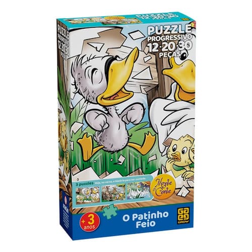 Com 3 quebra-cabeças que contam a história do Patinho Feio, a criança monta os quebra-cabeças e pode ler a história no verso da embalagem.