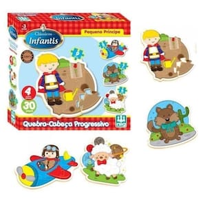 Descrição do produto: O quebra cabeça progressivo - clássicos infantis, estimula a concentração, o raciocínio lógico e a noção espacial da criança. As peças são todas em madeira e a pintura é feita na própria madeira, proporcionando assim mais durabilidade. São 3 modelos, colecione: os três porquinhos, cinderela e pequeno príncipe. Especificações: Código de barras: 7896200704311 Idade recomendada: a partir de 03 anos Atenção: não indicado para menores de 3 anos por conter partes pequenas que podem ser engolidas. Conteúdo da embalagem: 04 quebra cabeças - total de 30 peças - peças em madeira. Medida aproximada da embalagem a, l, c : 07x23x23cm Garantia: 60 dias Selo de segurança do inmetro: ce-bri/iqb-446 nm300/2002 ocp 0006 Certificação: certificado pelos órgãos autorizados - ocp´s organismos de certificação de produtos Fabricante/fornecedor: nig Aviso importante: todas as informações divulgadas são de responsabilidade exclusiva do fabricante/fornecedor. O produto e as cores podem variar do apresentado nas fotos da embalagem. Imagens meramente ilustrativas. Ean: 7896200704311