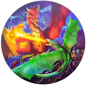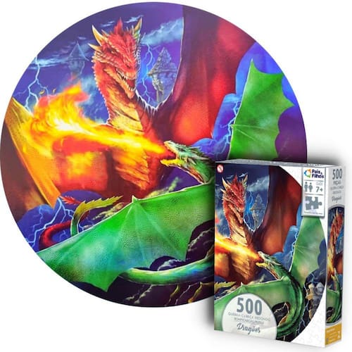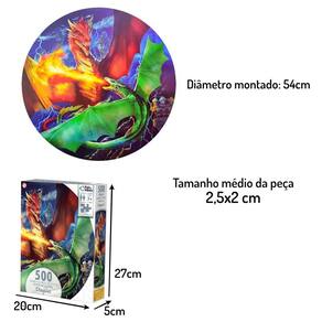 Quebra cabeça Redondo com linda imagem e decorativa imagem De uma super Batalha de Dragões que cospem fogo com 500 peças. Com um design inovador e cores vibrantes, este quebra cabeça proporciona a sensação de superação quando se consegue montar. As cores podem até ajudar, mas o grande segredo está no desenho das peças. Desafie-se!