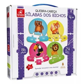 Quebra-cabeça Sílabas dos Bichos Madeira 2297 Brincadeira De Criança Quebra-cabeça Sílabas dos Bichos Madeira 2297 Brincadeira De Criança O Quebra-Cabeça Sílabas dos Bichos está de cara nova Agora com 24 quebra-cabeças, 86 peças Esse brinquedo f com que as crianças aprendam as palavras e silabas, das respectivas imagens. O jogo educativo Silabas dos Bichos também ajuda as crianças a desenvolver o raciocínio lógico, a atenção, concentração, percepção visual, sociabilização e a coordenação motora. As peças tem cores vivas, e imagens lúdicas, fendo com que seu pequeno aprenda brincando. Venha de divertir também Idade Recomendada: + 4 anos. Material: Madeira Garantia: Contra Defeitos de Fabricação Pro de garantia: 03 meses de garantia legal.