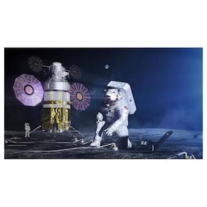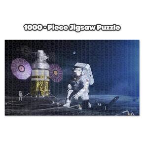 - Design interessante: o quebra-cabeça montado retrata uma cena hiper-realista, semelhante a uma fotografia, de astronautas vestindo trajes espaciais de exploração. Eles podem ser vistos caminhando na lua e montando uma base, com o planeta Terra visível à distância.