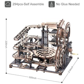 Nova corrida de mármore de madeira Construa com 294 peças e 10 bolinhas. O resultado final é bem legal. Possui uma manivela que usa grandes engrenagens para mover as bolinhas até o topo da máquina onde elas rolam em diferentes canais. Diferente de outros quebra cabeças de madeira, aparência preto cinza, placa de identificação de metal e peças de acrílico para tornar o produto final mais visualmente interessante e permitir que as bolas sejam vistas mais em ação. Um ótimo livreto de instruções com fotos grandes e detalhadas facilita a identificação das peças e deixa as instruções claras. Há uma folha de peças sobressalentes para o caso de você quebrar peças críticas durante a montagem. É uma ótima alternativa quando você está cansado de quebra cabeças. Este era mais avançado. Este modelo de corrida de mármore pode ser colocado em uma estante e acredite que seus amigos sempre perguntarão o que é e querem uma demonstração. Este quebra cabeça STEM será um excelente presente de Natal ou aniversário para quem gosta de trabalhar com madeira e adora um desafio, não apenas para adolescentes, levará cerca de 7 horas de concentração para montar corretamente Marca: Não Informado