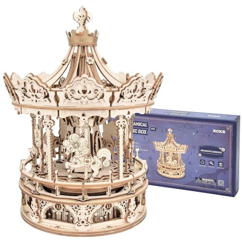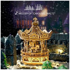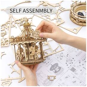 O Carrossel Infantil é um quebra-cabeça 3D mecânico único, feito de madeira cortada a laser, sem necessidade de cola. Suas peças pré-cortadas permitem uma montagem fácil e divertida. Ao enrolar a mola inferior, soltar e girar, você pode desfrutar da melodia suave do Carrossel enquanto 5 cavalos giram e sobem e descem no carrossel dos sonhos. As instruções detalhadas em inglês facilitam a montagem, que requer atenção e paciência para um acabamento perfeito. A escultura requintada em madeira ao redor do corpo da caixa de música, junto com a linda tampa superior, adiciona um toque elegante à decoração. Este quebra-cabeça de cavalo de madeira 3D é um presente criativo e fascinante para entusiastas de construção de modelos e quebra-cabeças. É especialmente recomendado como o melhor presente de Natal para namorado, namorada, marido ou esposa.