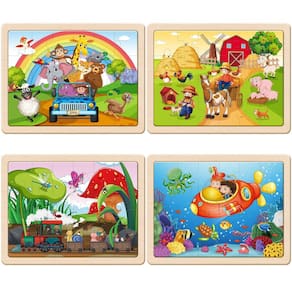 Divertidos quebra-cabeças de madeira para crianças — O conjunto de quebra-cabeças de madeira contém 4 pacotes de 24 peças de quebra-cabeças de madeira brilhante e duráveis que se encaixam perfeitamente quando montadas para mostrar 4 temas atraentes de animais de zoológico, insetos, fazenda e vida marinha. Tudo em uma caixa colorida.