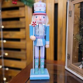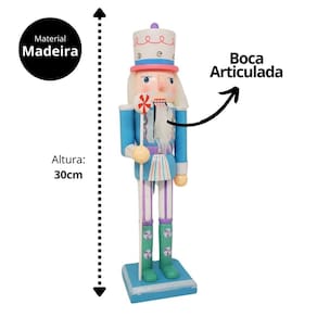 Adicione um toque lúdico e festivo à sua decoração com este boneco quebra-nozes temático no estilo candy! Com 30 cm de altura, ele é confeccionado em madeira e pintado em vibrantes tons de azul e roxo, proporcionando charme e cor à sua decoração natalina. Sua boca articulada é um detalhe clássico que traz autenticidade à peça.