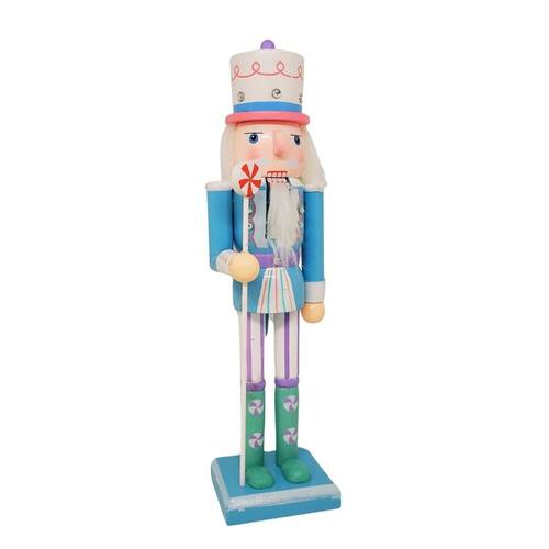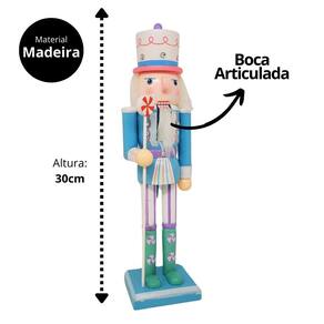 Adicione um toque lúdico e festivo à sua decoração com este boneco quebra-nozes temático no estilo candy! Com 30 cm de altura, ele é confeccionado em madeira e pintado em vibrantes tons de azul e roxo, proporcionando charme e cor à sua decoração natalina. Sua boca articulada é um detalhe clássico que traz autenticidade à peça.