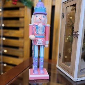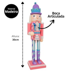 Adicione um toque lúdico e festivo à sua decoração com este boneco quebra-nozes temático no estilo candy! Com 30 cm de altura, ele é confeccionado em madeira e pintado em vibrantes tons de rosa, lilás e azul, proporcionando charme e cor à sua decoração natalina. Sua boca articulada é um detalhe clássico que traz autenticidade à peça.