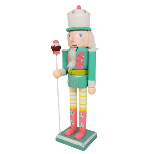 Adicione um toque lúdico e festivo à sua decoração com este boneco quebra-nozes temático no estilo candy! Com 30 cm de altura, ele é confeccionado em madeira e pintado em vibrantes tons de verde, rosa e lilás, proporcionando charme e cor à sua decoração natalina. Sua boca articulada é um detalhe clássico que traz autenticidade à peça.