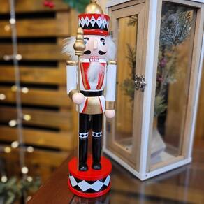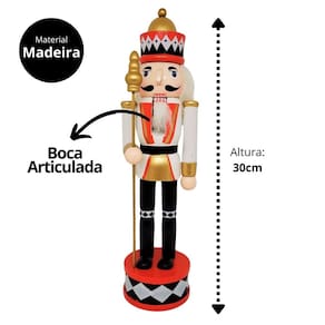 Incorpore elegância e tradição à sua decoração natalina com este boneco quebra-nozes modelo gala! Feito em madeira, ele possui uma combinação sofisticada de cores em preto, branco e vermelho, conferindo um visual clássico e imponente. A peça, com 30 cm de altura, conta com uma boca articulada, característica tradicional dos quebra-nozes.