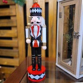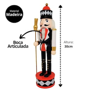 Incorpore elegância e tradição à sua decoração natalina com este boneco quebra-nozes modelo gala! Feito em madeira, ele possui uma combinação sofisticada de cores em preto, branco e vermelho, conferindo um visual clássico e imponente. A peça, com 30 cm de altura, conta com uma boca articulada, característica tradicional dos quebra-nozes.