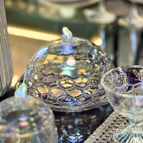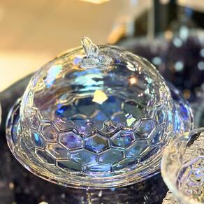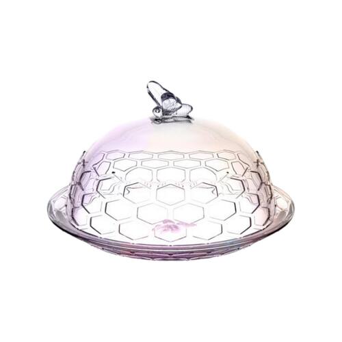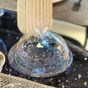 Queijeira em Vidro Bee Rainbow Haüskraft: beleza que encanta à primeira vista. Com acabamento furta-cor e delicada abelha decorativa, transforma o servir em arte.