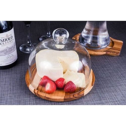 Queijeira redonda em madeira teca com tampa de vidro, prática para armazenar e servir queijos. Com 15,5 cm de diâmetro, mantém os alimentos protegidos e de fácil acesso. O acabamento em cera de abelha valoriza a textura natural da madeira, proporcionando toque suave, enquanto a tampa de vidro permite visualização rápida do conteúdo.