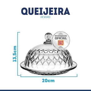 Especificação: Modelo: Queijeira com tampa Marca: GH3 ou Mek Material: Vidro Tamanho: 20 x 13,5 cm Peso total: 1kg.