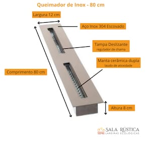 MODELO QUEIMADOR 80CM - Área de aquecimento : 60m² - Quantidade álcool no reservatório: 1,5L (cada reservatório) - Espessura chapa: 3mm - Modelo da tampa: Com regulagem para chama - Acabamento do tampo: Aço inox escovado - Dimensões: 14cm (largura) x 80cm (comprimento) x 08cm (altura) - Tempo de aquecimento estimado: 1,5h à 2,5h - Material do queimador: INOX 304 - Recorte no nicho para instalação: 12cm x 76cm - Revestimento interno: Manta cerâmica