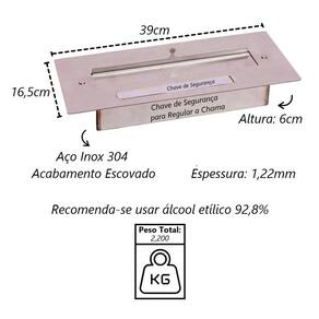 Queimador Lareira Portátil de Embutir Aço Inox 39x16,5x6cm