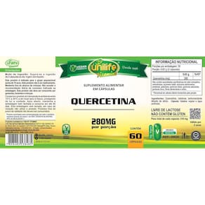Quercetina unilife 60 cápsulas Quercetina é um flavonoide derivado de planta, isolado de cebolas, maçãs, uvas, vegetais folhosos e chás, principalmente do chá verde camélia sinensis . É geralmente conhecido por suas propriedades antioxidantes e anti- inflamatórias. Modo de ingestão: sugere-se a ingestão de 2 cápsulas ao dia. Ingerir com líquido. Ingredientes: quercetina, celulose, antiumectante dióxido de silício. Cápsula: gelatina vegetal e água purificada. Peso total de cada cápsula: 310mg. Livre de lactose. Não contém glúten. Produto vegano. Marca: Não Informado Ean: 7898483538485