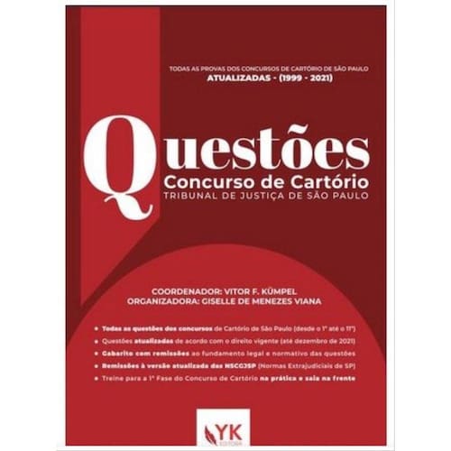 Todas as questões dos concursos de Cartório de São Paulo (desde o 1º até o 11º). ? Questões atualizadas de acordo com o direito vigente (até dezembro de 2021). ? Gabarito com remissões ao fundamento legal e normativo das questões. ? Remissões à versão atualizada das NSCGJSP (Normas Extrajudiciais de SP) ? Treine para a 1ª Fase do Concurso de Cartório na prática A resolução de questões é uma das bases do estudo para qualquer prova. Para proporcionar uma melhor preparação para o concurso de Outorga de Serventias Extrajudiciais do Estado de São Paulo, a presente obra traz um compilado de todas as questões que já figuraram nessa concorrida prova, desde o primeiro concurso, em 1999, até o último, realizado em 2019. Todas as questões foram revisadas e atualizadas de acordo com o direito vigente, de modo que o leitor poderá treinar e simular sua performance com questões atualizadas e, ao mesmo tempo, fiéis ao conteúdo exigido nas provas pretéritas. Para facilitar ainda mais o estudo, o gabarito final traz remissões indicando o fundamento legal ou normativo da resposta considerada correta. Dessa forma, permite-se que o leitor confira a base jurídica das questões resolvidas e aprofunde seu estudo nos pontos necessários. Ean: 9786588043271