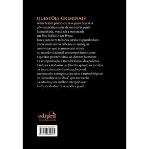 Questões Criminais reúne textos preciosos, nos quais Beccaria põe em prática parte de sua teoria penal humanitária, ventilada e sustentada em Dos Delitos e das Penas. Esses pareceres técnicos jurídicos possibilitam interessantíssimas reflexões e analogias com temas que permanecem atuais no mundo ocidental contemporâneo, como: a questão penitenciária, os direitos humanos e a reorganização e transformação das polícias. Tanto os estudiosos do Direito, quanto os juristas da área criminal e da execução penal encontrarão exemplos concretos e metodológicos de “consultoria jurídica”, que nortearão os estudos para melhor interpretação histórica da doutrina jurídica penal.