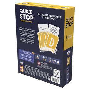 Regras intuitivas: Com o Quickstop, cada jogador começa o jogo com uma mão de 5 cartas. Cada carta representa uma letra do alfabeto, e seu desafio é responder aos temas dados dizendo uma palavra que comece com a letra indicada na carta. Simples, certo?