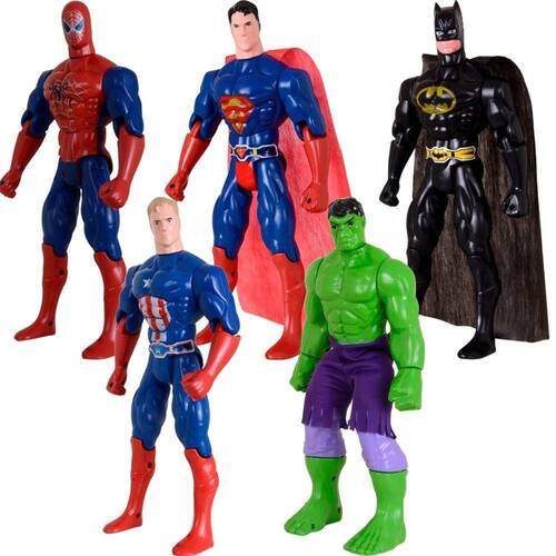 1 Boneco Articulado Capitão América 29cm; 1 Boneco Articulado Homem Aranha 29cm; 1 Boneco Articulado Super Man 29cm; 1 Boneco Articulado Batmam 29cm; 1 Boneco Articulado Hulk 29cm;