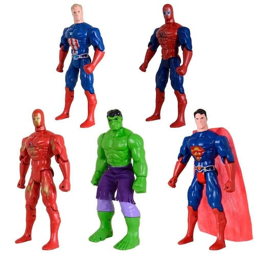 1 Boneco Articulado Capitão América 29cm; 1 Boneco Articulado Homem De Ferro 29cm; 1 Boneco Articulado Homem Aranha 29cm; 1 Boneco Articulado Super Man 29cm; 1 Boneco Articulado Hulk 29cm;