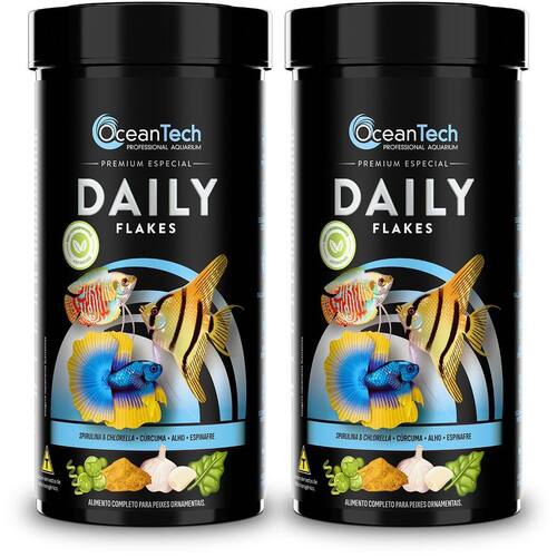 Ração OceanTech Daily Flakes 400g alimento completo com spirulina, chlorella, alho e cúrcuma para peixes ornamentais de todas as espécies - Mega Aquários Composição do kit: 2 potes Ração OceanTech Daily Flakes 200g Validade: produto com longa validade Fabricado no Brasil